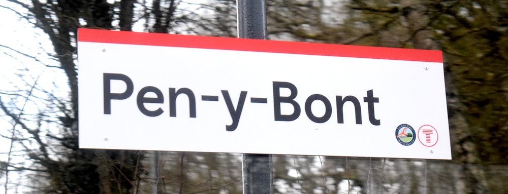 | Bridgend | Pen-y-bont original rendition Pen-y-Bont rendition over station entrance doors Pen-y-bont ar Ogwr later rendition Pen-Y-Bont Ar Gowr † no longer used by 2022 Croeso i Orsaf Pen-y-bont ar Ogwr 'Welcome to Bridgend station' PEN Y BONT rendition on station lift tower |