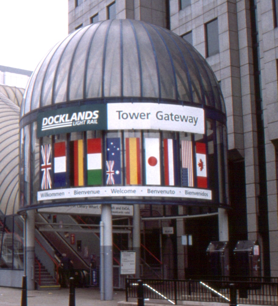 Tower Gateway (Docklands Light Railway) had a welcome sign in Spanish (Bienvenidos), but not including a translation of the station name.