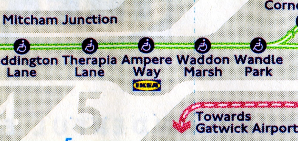 | Ampere Way Croydon Tramlink | Ikea | May 2022 Transport for London 'map', sponsored by Ikea, has Ikea logo with station name, but this does not appear on physical signs | ![]() |