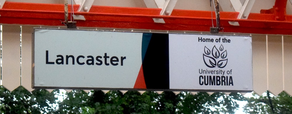 Lancaster | Lancaster University | Home of Lancaster UniversityVirgin Trains branding on main sign Wall mounted version Photo: 1 July 2015; removed by 2021 |