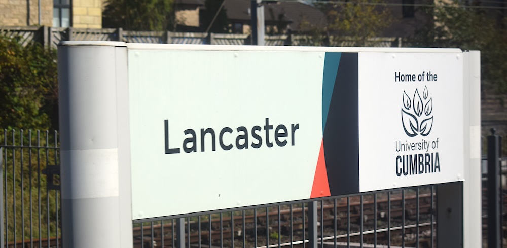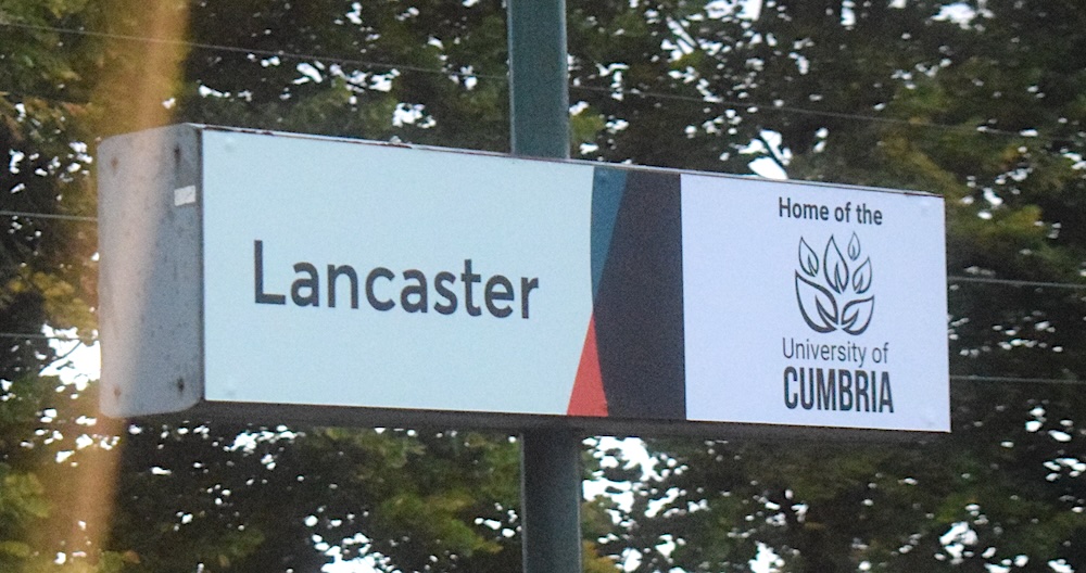 Lancaster | University of Cumbria | Home of the(in black text above logo on green) Running in board version Photo: 4 April 2024; removed by 15 September 2025 |