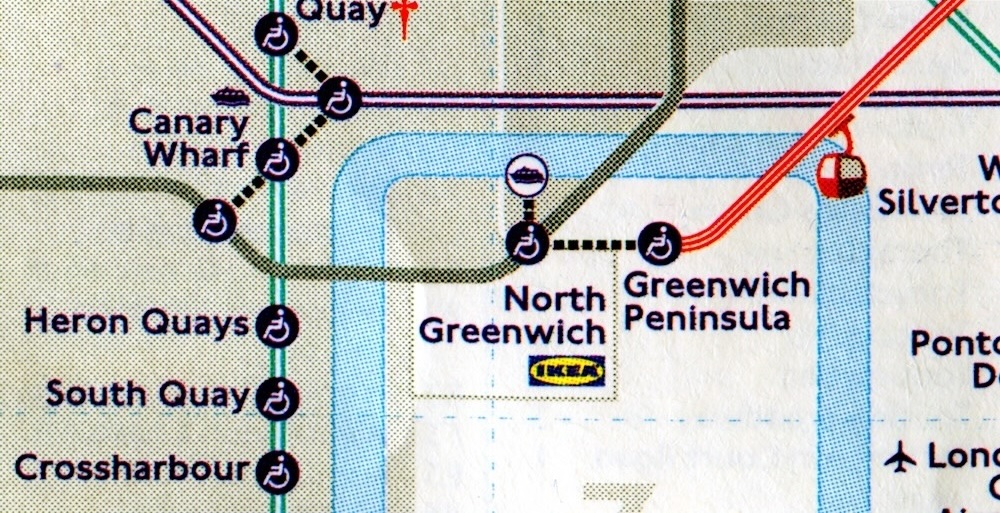 | North Greenwich London Underground | Ikea | May 2022 Transport for London 'map', sponsored by Ikea, has Ikea logo with station name, but this does not appear on physical signs | ![]() |