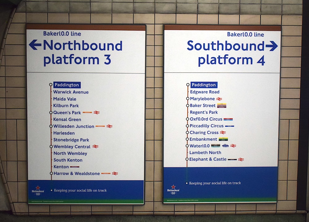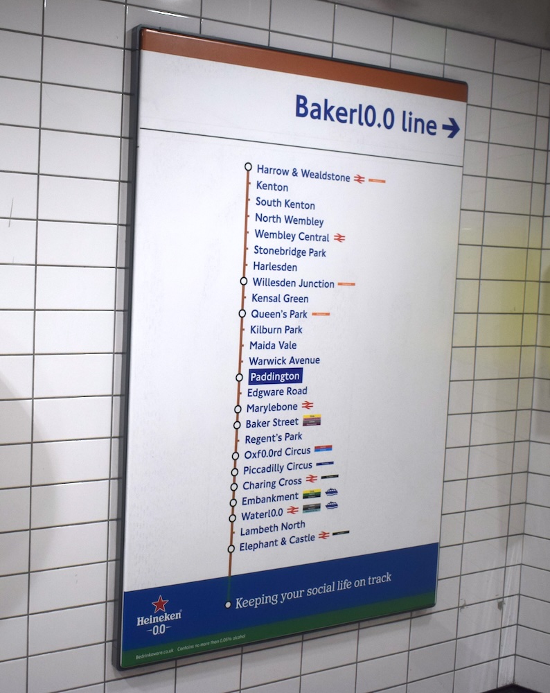 | Paddington London Underground | Heineken | Heineken(in roundel above name), -0.0-(in roundel below name), Proud partner of Bakerl0.0(in adjacent plate) Photo: 9 January 2026; known to be present 8 January 2026; applied for two weeks |