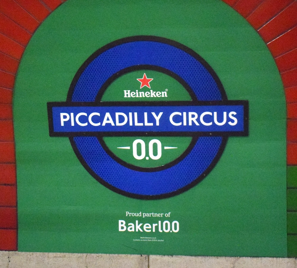 | Piccadilly Circus London Underground | Heineken | Heineken(in roundel above name), -0.0-(in roundel below name), Proud partner of Bakerl0.0(below plate) Photo: 9 January 2026; known to be present 8 January 2026; applied for two weeks |