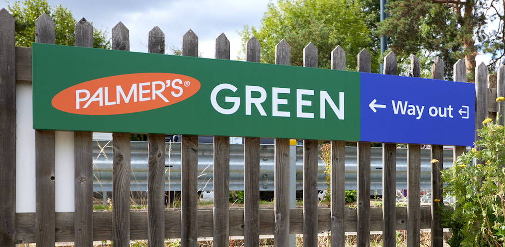 | Palmers Green | Palmer's | Welcome to(above, with logo to left of 'Green', white text on green background) Sign over station entrance Photo: August 2022; believed removed mid-September 2022 |