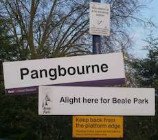 | Pangbourne | Beale Park | Alight here for Beale Park(with logo to left) Monochrome logo version (possibly colour with blue fully faded); still present 24 June 2023 Photo: 28 November 2014; still present 26 June 2023 |