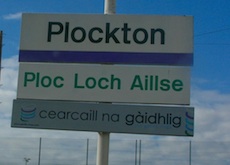 | Plockton | The Gaelic Rings | cearcaill na gàidhig(in black text in centre); the gaelic rings(in blue text below), with logo and web address to left and partial logo to right Old name form Photo: 17 August 2010; removed by August 2012 |