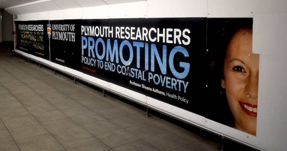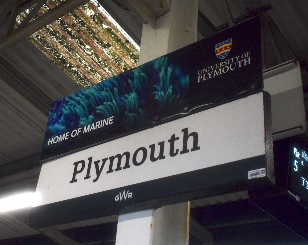 | Plymouth | Plymouth University | Plymouth researchers unearthing the roots of soil erosion; (logo); Plymouth researchers promoting policy to end coastal poverty(with images of researchers at each end) Additional advertising in station subway Photo: 14 November 2025 |