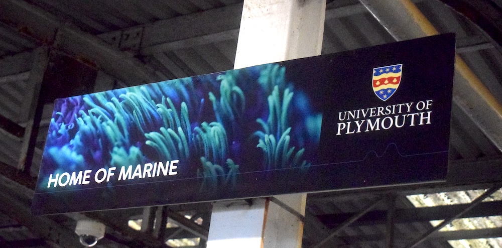 | Plymouth | Plymouth University | Home of marine(in white text on black under sea life image to left, logo to right) Wall mounted version below main name sign Photo: 14 November 2025 |