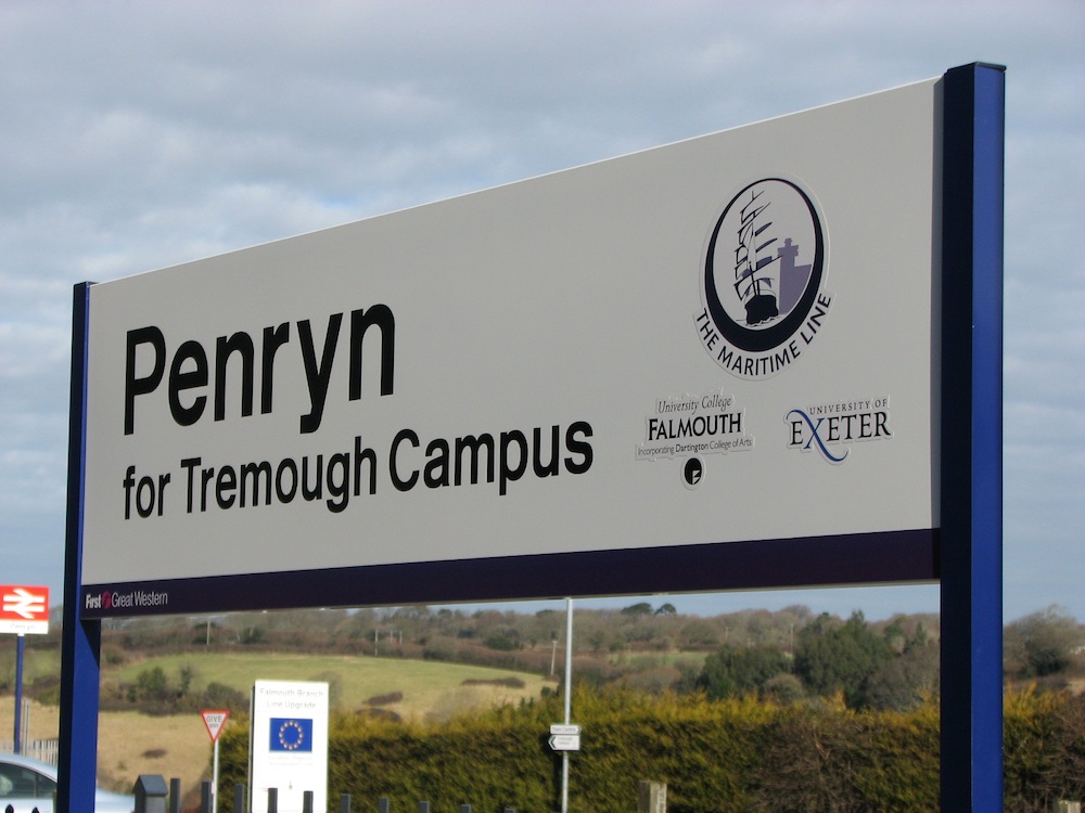 | Penryn | University College Falmouth/University of Exeter | University College Falmouth incorporating Dartington College of Arts(college badge towards lower right)/ University of eXeter(college badge at lower right), both under Maritime Line logo Version with additional direction sign Photo: 4 June 2014 |