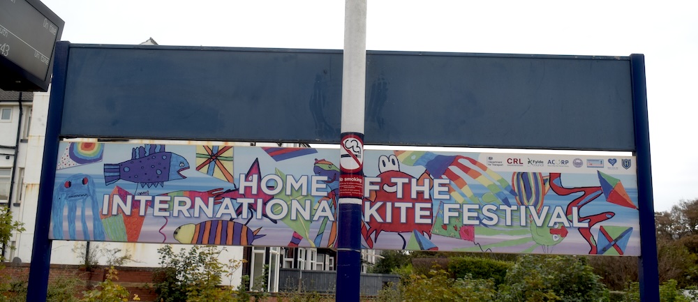 | St Annes-on-the-Sea | International Kite Festival | Home of the International Kite Festival(in white text on multi-coloured kite image; multiple supporter logos to top right; Lancashire County Council logo on main name sign) Version with main name sign Photo: 19 September 2025; known to have been present 20 October 2018 |
