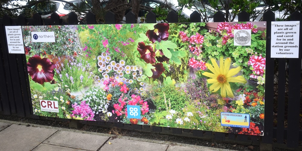 | St Annes-on-the-Sea | St Annes-on-the-Sea Town Council, CRL, Co-op and community rail partnership | (floral image with supporter logos around it) Additional publicity outside station Photo: 19 September 2025 | ![]() |