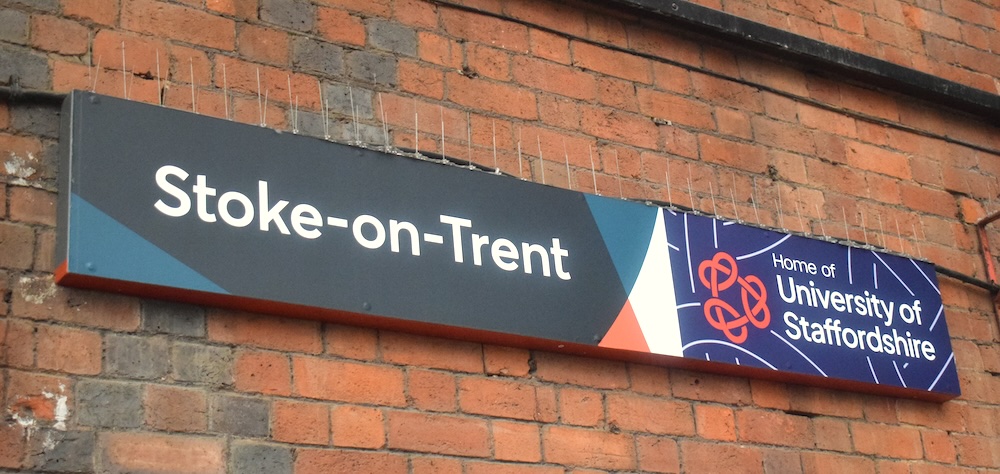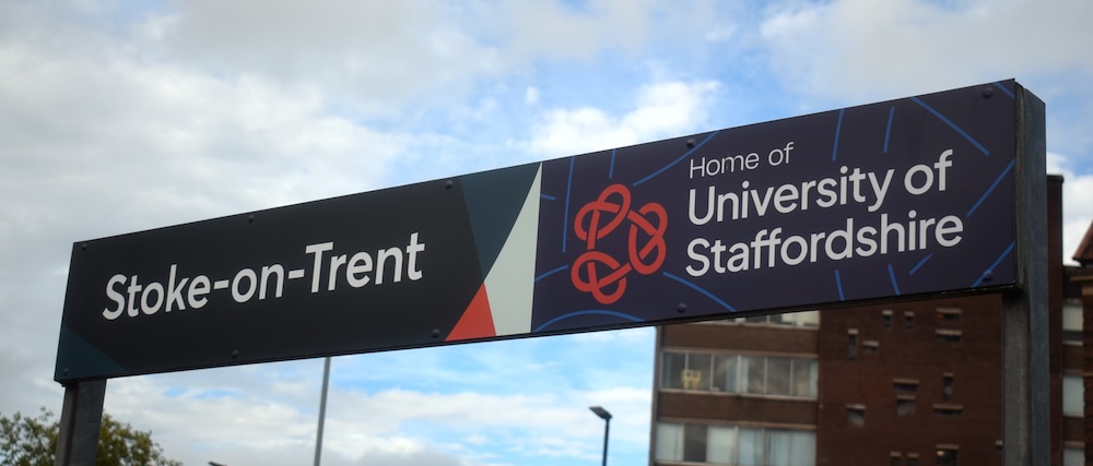 | Stoke-on-Trent | University of Staffordshire | Home of(logo) Your place of possibility(in white text on dark blue to right) Running in board version Photo: 17 September 2025 |