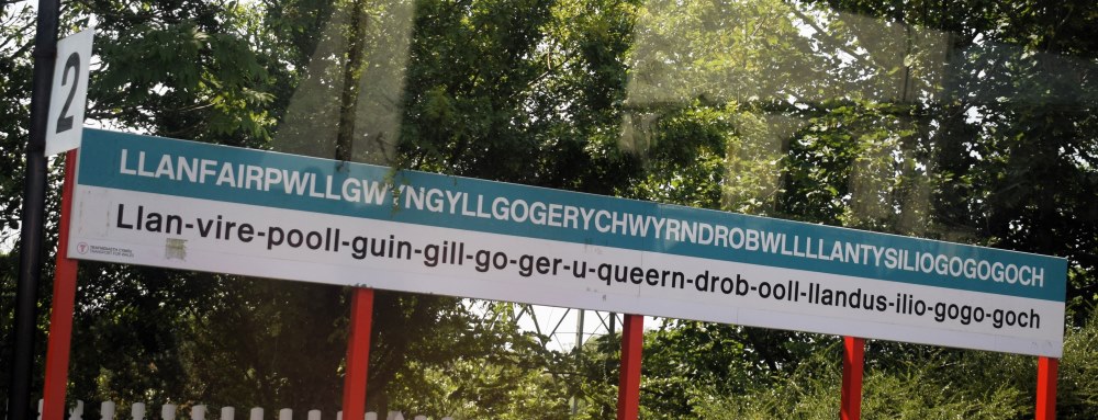 | Llanfairpwll | Llan-vire-pooll-guin-gill-go-ger-u-queern-drob-ooll-llandus-ilio-gogo-goch | Pronunciation assistance | Sign fitted by May 1991 (exact form varied over the years) |